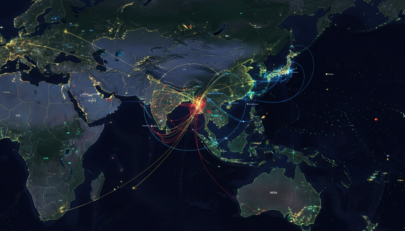 Night view of the East Asia–Pacific region on a digital globe, with glowing coastlines, dense city lights, and curved routes of ships and aircraft crossing contested seas and island chains.